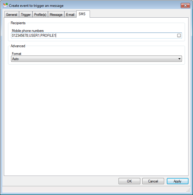 - You can enter a User name or User profile from PcVue's User Accounts. If you enter a User name, the message will be sent to the mobile number that was entered in the User's configuration. If you enter a User profile, the message will be sent to all Users attached to that profile.