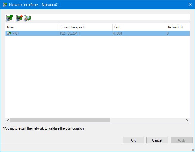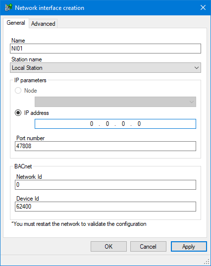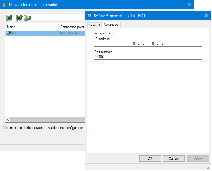 It includes the exact list of network interfaces each BACnet network producer station will use to access a BACnet network. Each Network Interface includes several BACnet properties, in particular the Device Id that PcVue uses for the BACnet device object it exposes to the other devices on the network.