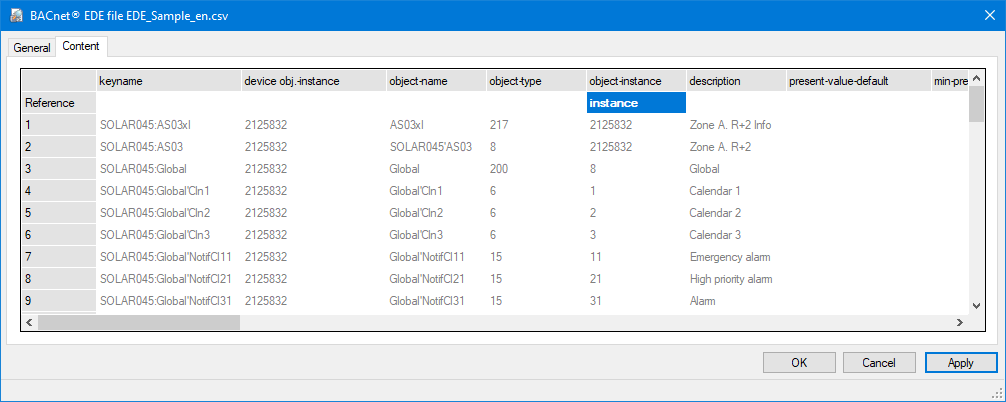 PcVue allows referencing EDE files containing up to 10 000 BACnet objects. If an EDE file contains more objects, it can be split over multiple files.