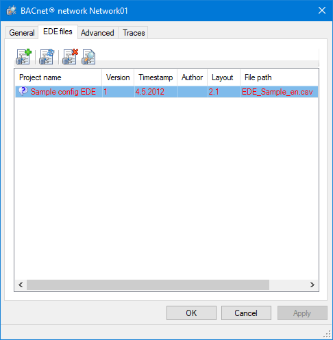 It is not always practical to scan the BACnet network to discover the available devices. For example, the network might not be complete or you could be developing the application at a different location. As an alternative, you can use the device configuration from one or more EDE (Engineering Data Exchange) files. We call this offline configuration as opposed to online configuration when scanning the network for devices.
