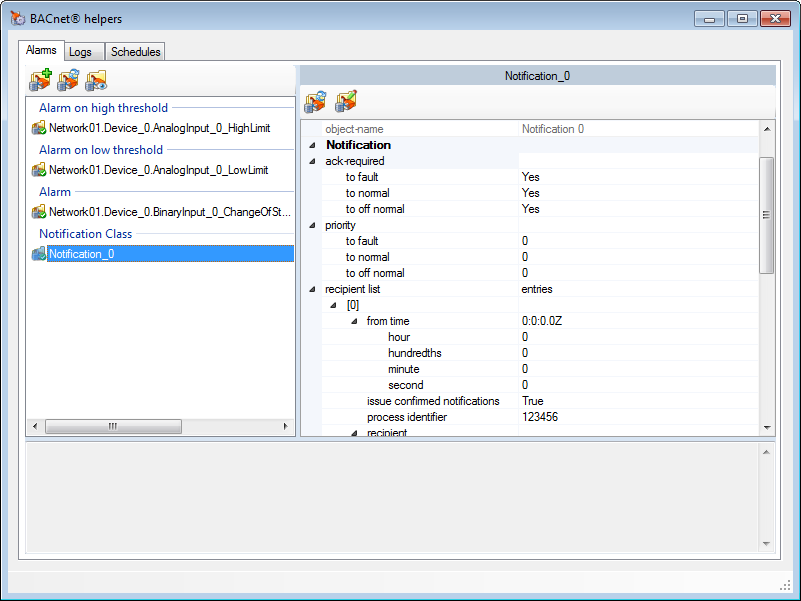 The Alarms tab of the Helper dialog provides useful information about, and can be used to manage, PcVue configuration objects related to BACnet Alarms and Event notifications. The tab includes tools to add and delete Notification Class instances, change properties, and to view notifications from those Notification Class objects in which PcVue has been configured as a recipient.