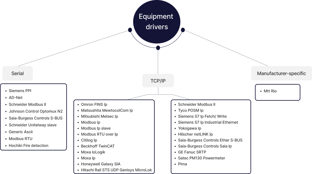 Equipment in PcVue comprises multiple data acquisition drivers of different types such as TCP/IP, serial, and manufacturer-specific drivers. PcVue supports a wide range of drivers as in the illustration below. Click on a driver to learn more.