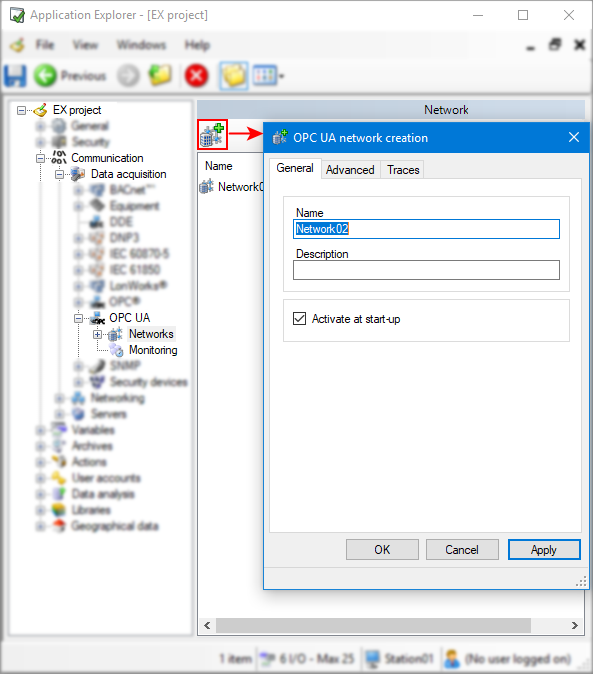 Click on the Add a network button on the toolbar. The OPC UA network creation dialog appears.
