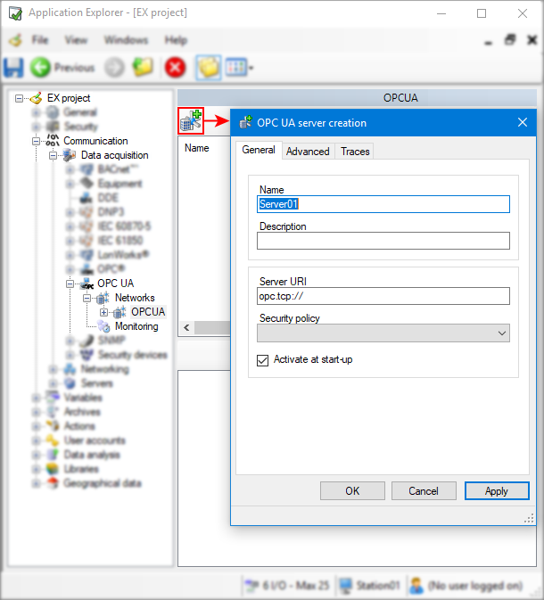 OPC UA servers can be configured in PcVue via the Application Explorer. The configuration starts with creating an OPC UA network and adding a server to the network.