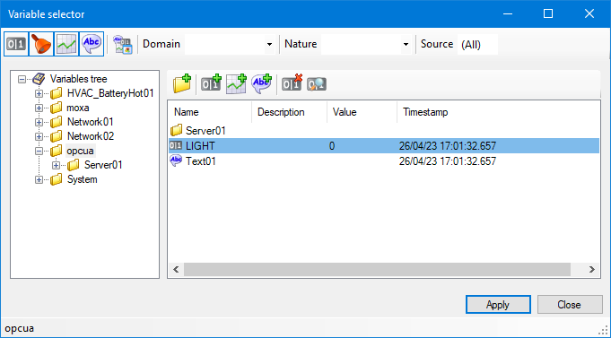 In PcVue, OPC UA server variables can be linked to existing variables in the project or can be added as new variables. This linking process can be carried out from the server mapping dialog.