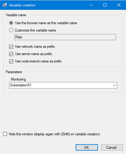 (map new variable selection) Click Map new variable, define a variable name and monitoring parameters in the creation dialog. Once created, the new variable can be found in the Variables tree.
