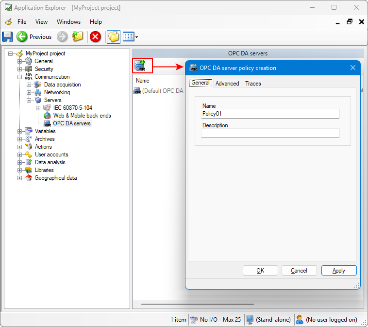 The traces in the OPC DA server access control policy are activated once you click Apply after having configured the general and advanced properties.