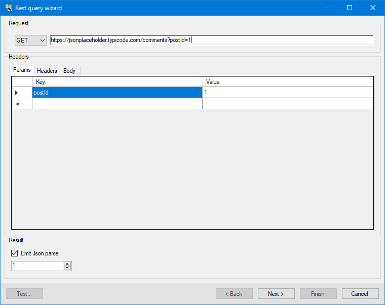 - Enter the full API Uri, including query parameters. The Params grid is instantly populated with the query parameters included in the Uri of the request.