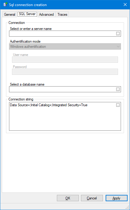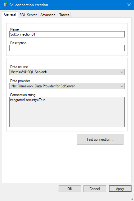 The required ADO.NET provider must be installed on the computer used for configuration purpose, and also on runtime computers belonging to the list of Servers of the Sql connection (see Advanced properties below).
