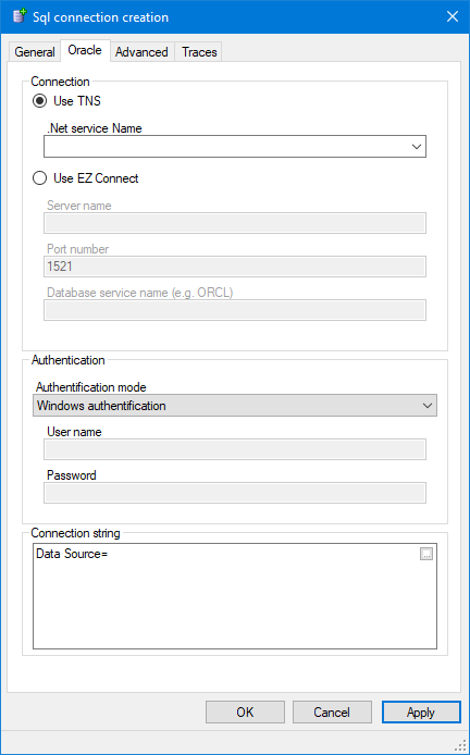 - If using TNS an Oracle configuration file, tnsnames.ora, provides the connection parameters. The .Net Service Name drop down list box is populated using the contents of this file and the appropriate entry must be selected.