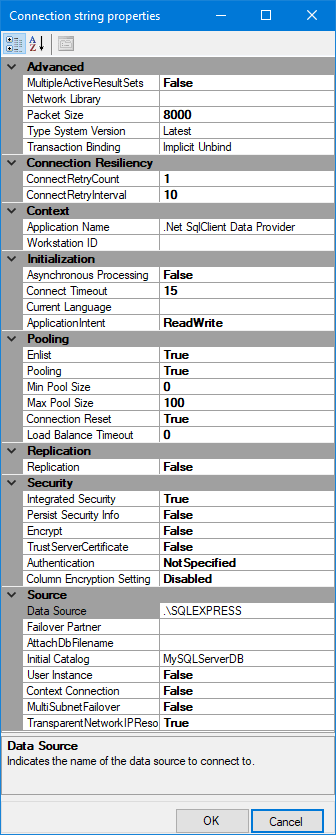Much of the configuration that takes place in the Data Connection dialog is used to generate a connection string that is then used by PcVue when connecting to the database. Advanced users can edit the connection string directly in the Sql connection dialog from the server specific tab. The Ellipsis button adjacent to the Connection String field displays a list of available properties as exposed by the selected ADO.NET provider.