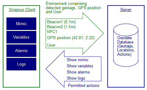 - SnapVue sends information to the server about the context of the connected user, detected geo-tags, and its GPS position (if available).