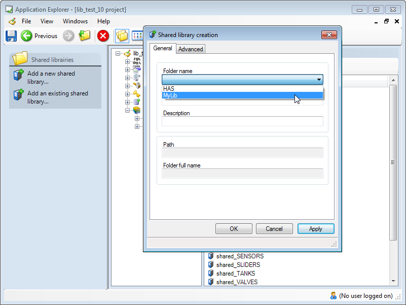 - Click the Folder name drop down list box. In it will appear a list of library folders that the Application Explorer has found, but are not yet configured in the project.