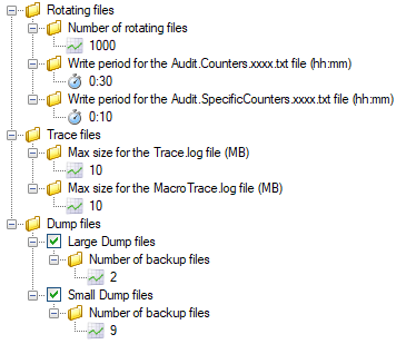 - Audit Specific Counters period - The period at which each new memory specific audit file is created. The default value is 10 minutes, minimum value 1 minute, maximum value 24 hours.