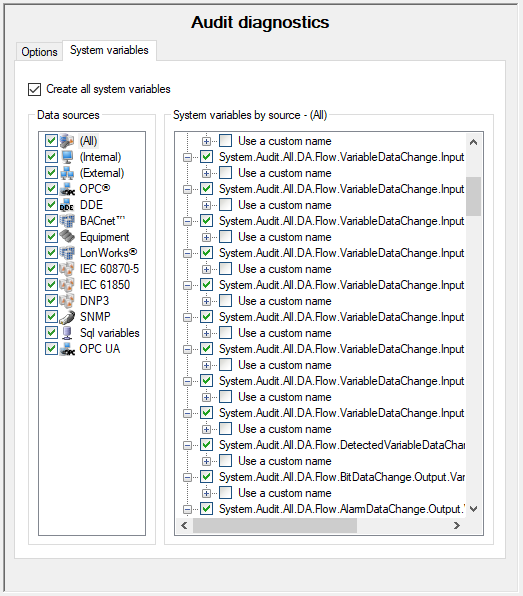 If you want to use any of the audit system variables in the application, they must be enabled using the System Variables tab of the Audit Settings dialog. For each variable, you can use the default name or choose your own. The Create all system variables tick box can be used to create all the variables, but before you do this you should consider the impact on system performance. There are over 1000 variables. Show picture