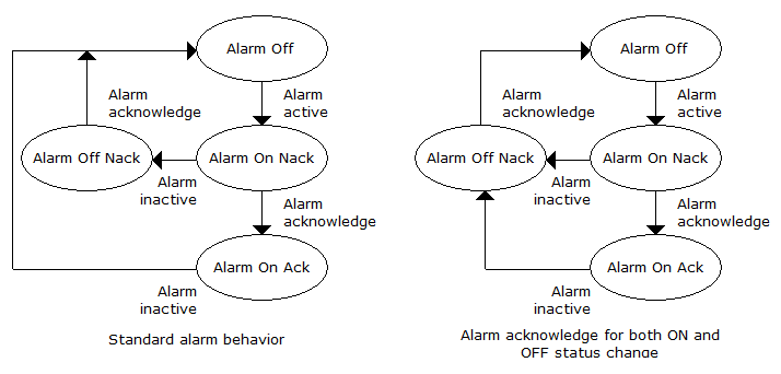 - Alarm acknowledge of both ON and OFF status change - If selected an alarm must be acknowledged on the transition to both the on state and the off state.