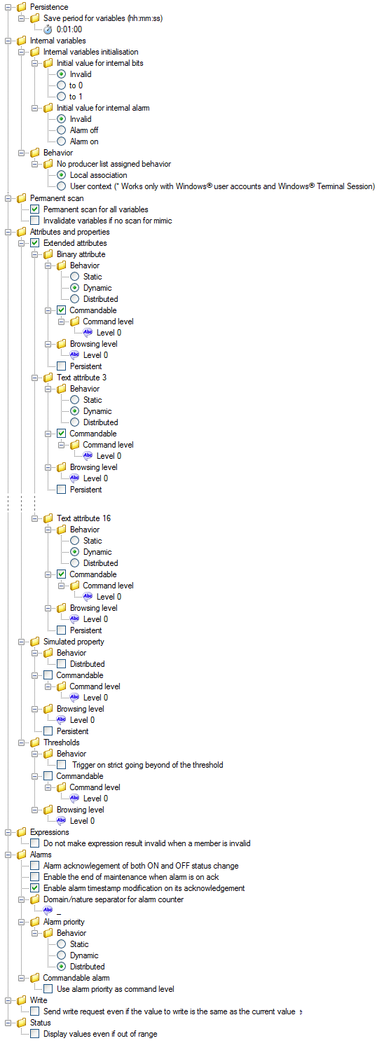- Persistent - The value of the attribute is saved when PcVue is shut down and restored when it is restarted. The variable itself must be Saved for this setting to take effect.