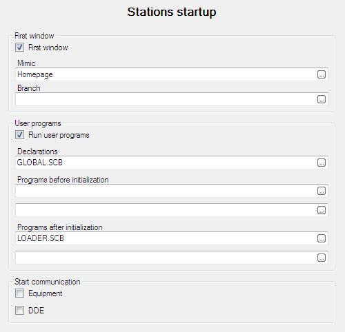 To start native communication drivers and DDE exchanges at start-up you must tick the corresponding boxes. Whilst developing a project it is often convenient not to start communication or DDE exchanges automatically in which case they can be started manually from the communication and DDE configuration dialogs.