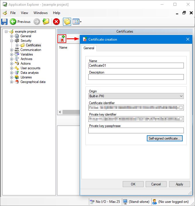 Security certificates in the Application Explorer helps you handle certificate that are used for secure exchanges of information between PcVue and external systems.