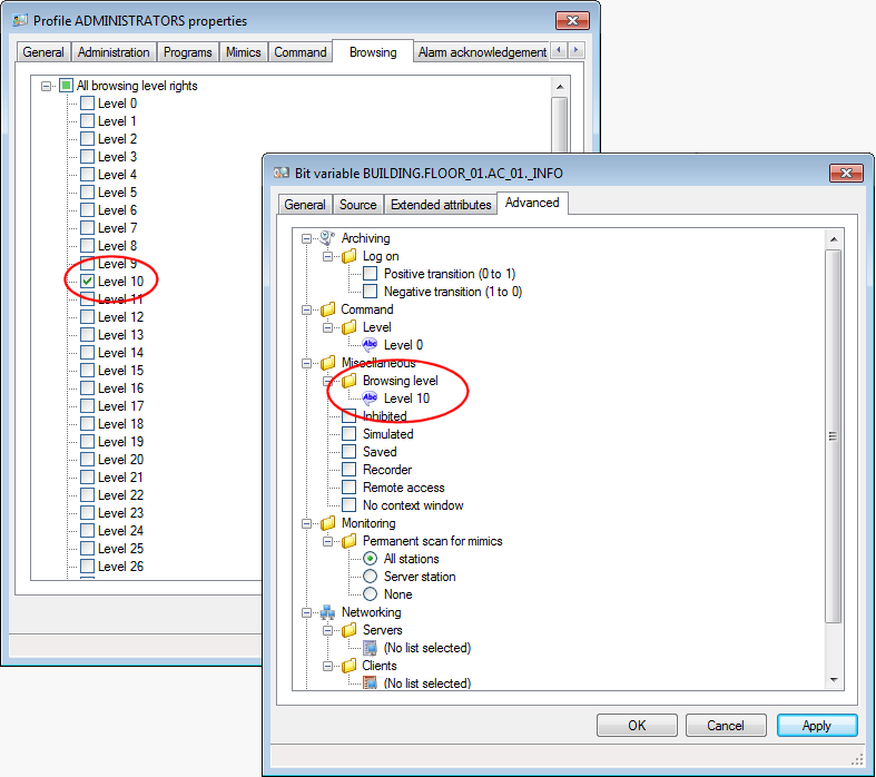 The properties in the Browsing tab control which variables a client application (including third party applications) can see when browsing variables exposed by PcVue. In order for an application to access a variable, the user authenticated on the API of PcVue, must have the corresponding browsing level right in its profile. Show picture.