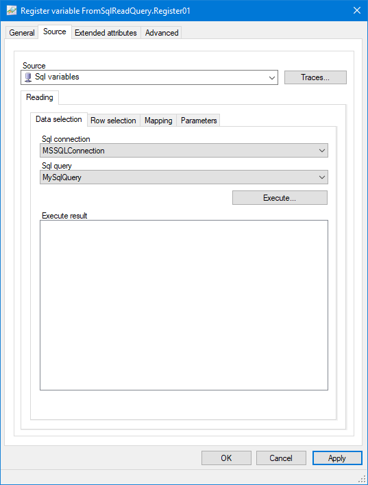 - Select the Sql connection and the subordinate Sql query. The appearance of the Source tab is now modified to display three more sub-tabs, Row selection, Mapping and Parameters.