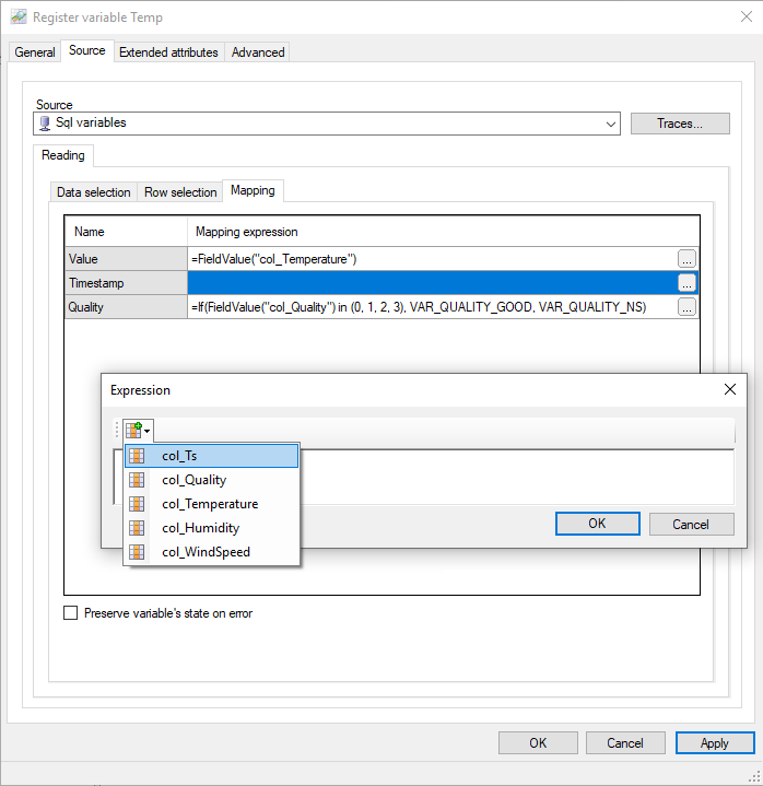 The Mapping tab is used to map the fields containing the value, and optionally the timestamp and the status (quality) to the variable. Mapping is achieved with an expression taking advantage of the FieldValue() function with the name of the column of interest as argument. The expression is entered using the Expression Editor dialog. See the topic Using the Expression Editor. If the Sql read query has been tested using the Execute button, clicking the button at the top left of the dialog displays a list of the available fields. Show picture