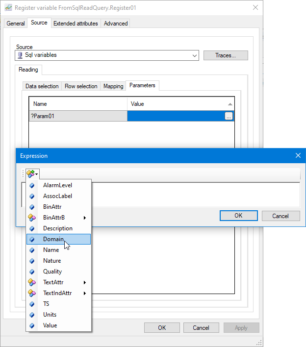 A parameter defined by an expression can reference a property of the variable (domain, Extended attribute etc.) and use the functions and operators of the expression engine. The button at the top left of the expression editor dialog displays a list of the variable properties that can be substituted. Show picture