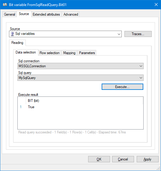 - Even though the configuration is only partially completed, it is possible to test the query using the Execute button. If the query requires any parameters, you are prompted to enter them. The results from the query are displayed in the result field. Testing the Sql Query has the advantage of discovering the Field Names that are returned by the query. The field names are used in the other configuration tabs. In the following screen shot the field name that has been discovered is BIT. It is followed, in parenthesis, by the field type.