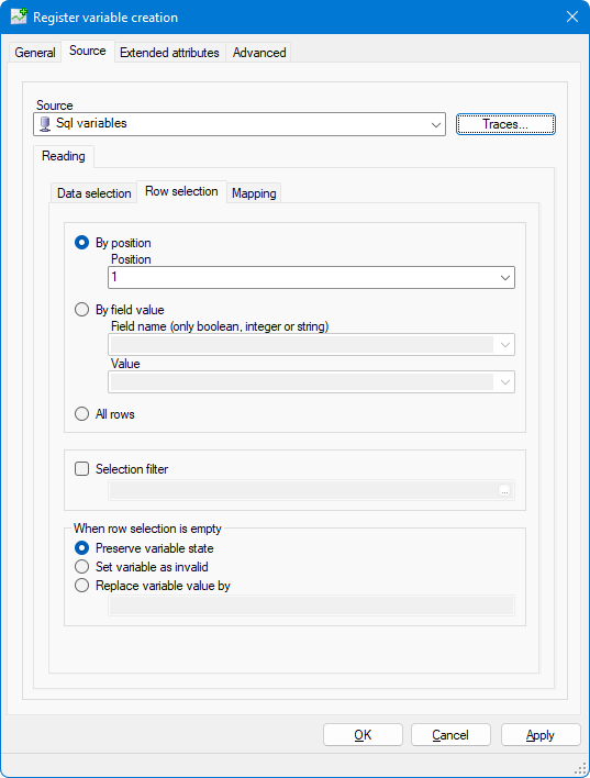 When using the By position option, keep in mind that any ORDER BY clause in your Sql query affects the result you will obtain. In most cases, changing the ORDER BY clause in the query requires changing the value of Position in the variable mapping.