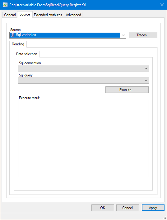 - Select Sql Variables as the Source. Sql Variables is only available if one or more Sql connections have been configured.