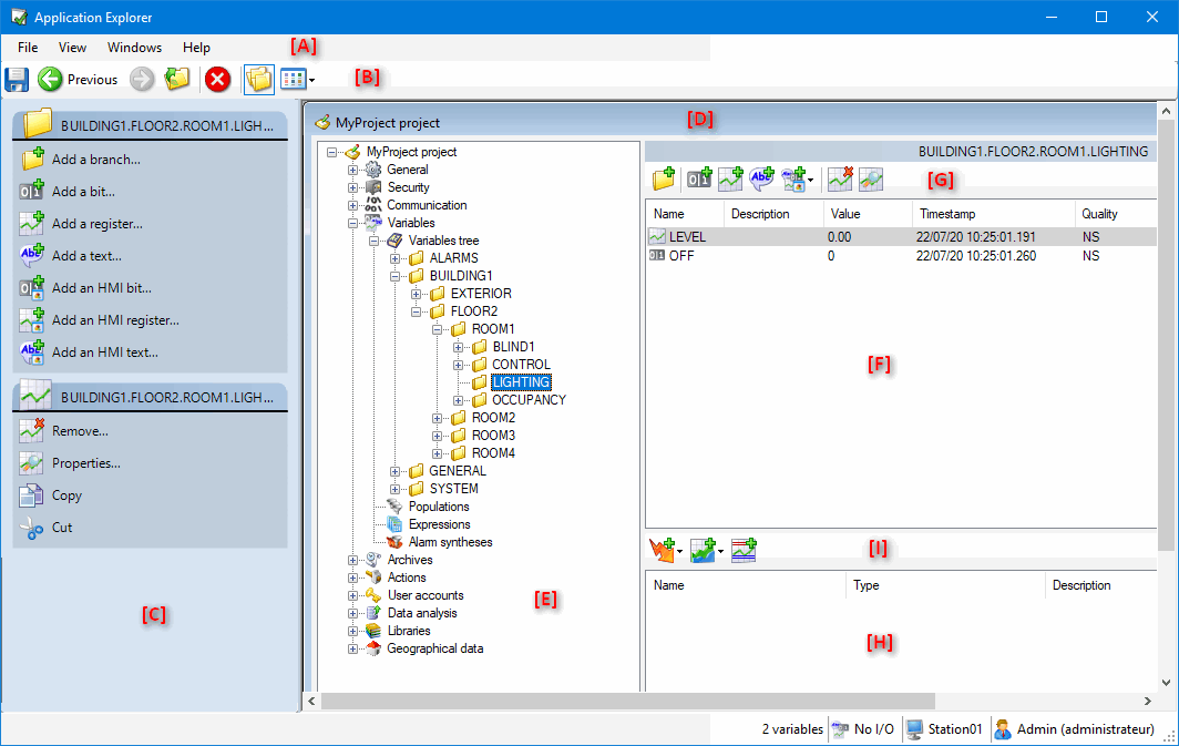 The Application Explorer is an explorer style configuration tool that can be used for the majority of the project configuration (mimics excluded) with the notable exception of the configuration of Equipment communication protocols. The Application Explorer is opened from the menu using the command Configure.Application Explorer. Show picture
