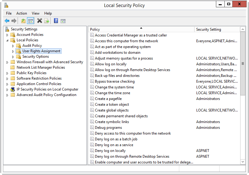 You can control which accounts have which system privilege by using Local Security Policy that can be accessed from the Windows Control Panel or directly from the SV Core Management Console using Tools. Local Security Policy. The relevant Local Security Policy path is Security Settings\Local Policies\User Rights Assignment. Show picture