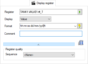 The timestamp of a variable is the time at which the value last changed. To display the timestamp you append .#_T to the variable name in the Display Register animation. For example, to display the timestamp for TANK1.VALVE1 you would use TANK1.VALVE1.#_T. To display the timestamp correctly you must use the Custom Display Format option and select DATE for the received unit and the appropriate format for the output unit. For example, hh:nn:ss dd/mm/yy@t Show picture