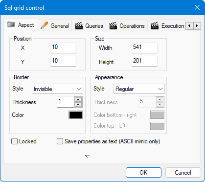 Click Sql grid, the Properties dialog of the control opens. The first tab is Aspect tab, here you can configure the following properties:
