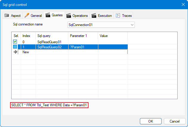 To define the default Sql query, tick the Sel checkbox for the desired query. It is possible to validate the configuration without any default query selected, an associated index variable must then be used to specify the default query. SCADA Basic scripting can also be used to select the query to execute.