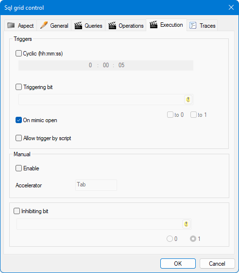 Select Execution tab. Here you can set the execution properties of a Sql read query. It’s possible to trigger it cyclically, on a trigger, by script or with an accelerator key. It’s also possible to inhibit the query execution. The following properties can be configured: