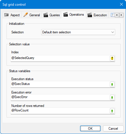 Selection - Defines how the default query to execute is selected. There are two options: If set to Default item selection, the selected query in the Queries tab is used. If set to Index variable value, the query is selected according to the value of the Index variable.