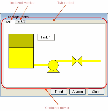 Each page is developed as a separate mimic before you configure the tab control. For example, if you had a mimic with two pages, it would require three mimics in total, one for the container and the other two for the pages. A mimic in a tab behaves as an included mimic but instead of being included in a mimic, it is included in the tab control.