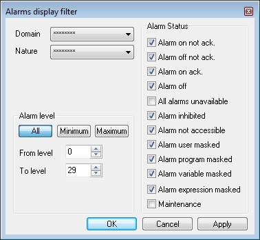 - To display an alarm masked using by operator the filter Alarm user masked must be ticked.