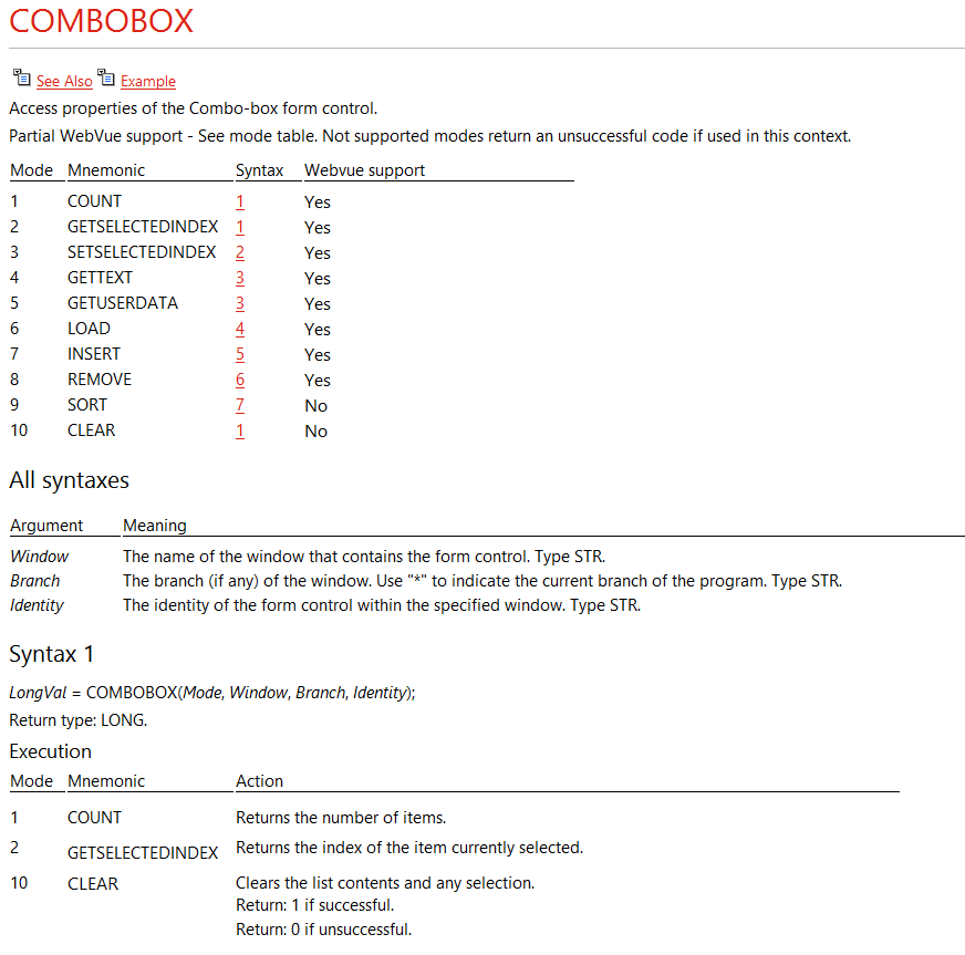 An instruction may have several modes with which to achieve different effects. If so, the instruction's topic starts with an index of which syntax to use for each mode. The Syntax column of the index provides links to the syntax sections. The effects of each mode are defined in the syntax section concerned.