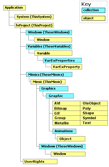 To manipulate HMI objects, you must know the relationships among them. The highest level object is Application. All other objects are subordinate to it, so you can use the Application object's properties and methods to access the subordinate objects.