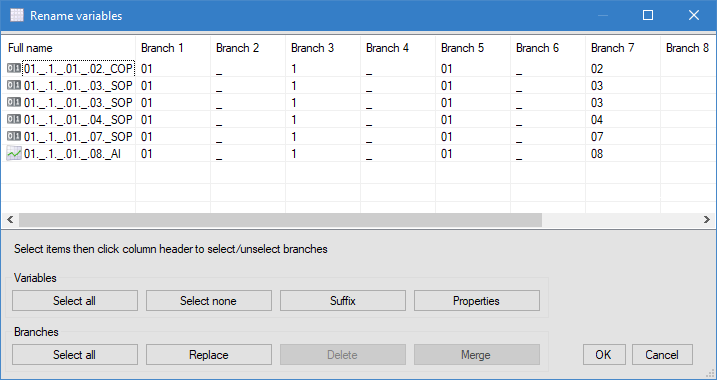 The Rename variables dialog is designed to make it easy to give a final polish to variable names and fix invalid ones, and also to bulk modify variable properties, to set the Command level or Alarm property for example.