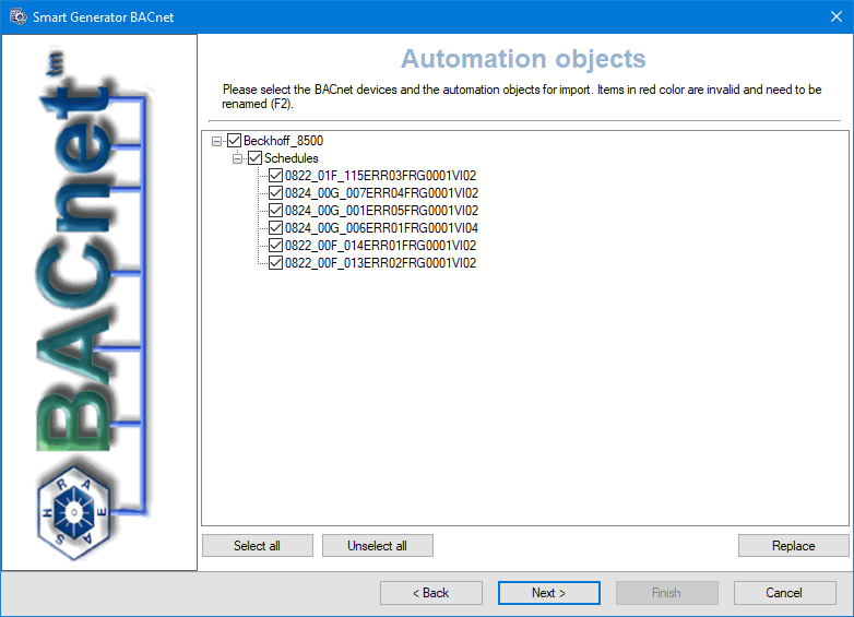 Click Next, the Automation objects dialog opens. Select those devices and Automation objects that are to be imported such as Notification Class, Schedule, Calendar, Trend Log, and Trend Log Multiple. You can click the Replace button to open a search and replace dialog that can be used to change the names of the devices or Automation objects.
