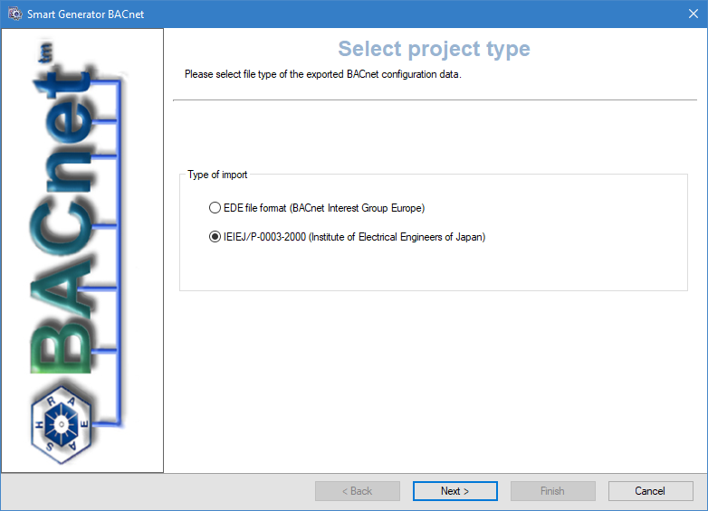 Select the type of the BACnet configuration file to import in the Select project type dialog. You can select either EDE or IEIEJ.