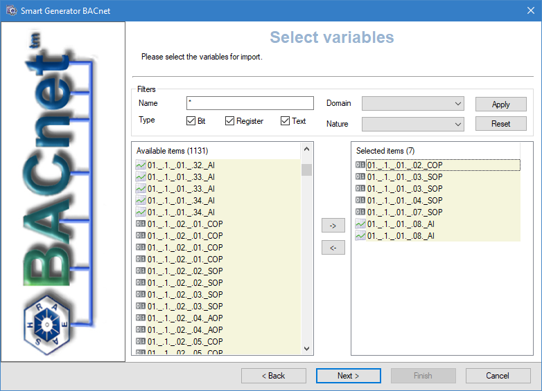 The Smart Generator for BACnet allows you to import a BACnet configuration file to generate the following PcVue configuration elements:
