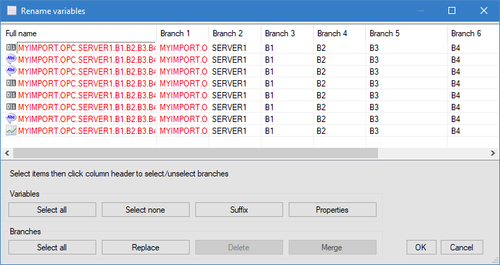 The Rename variables dialog is designed to make it easy to give a final polish to variable names and fix invalid ones, and also to bulk modify variable properties, to set the Command level or Alarm property for example.