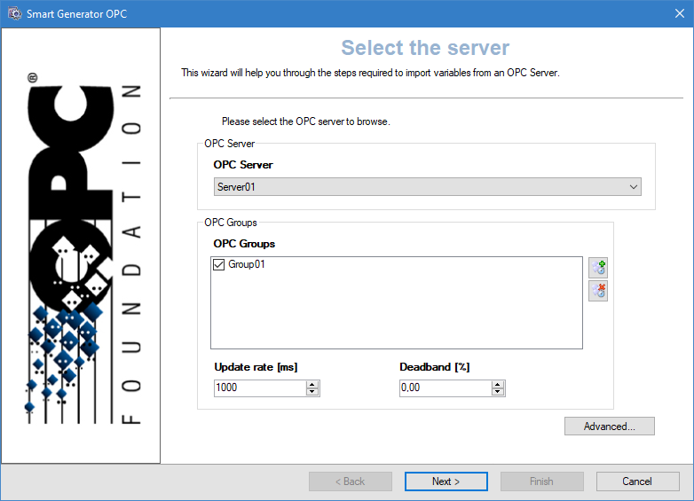 You have configured the connection to the OPC Server, and the group to which new variables will be mapped in PcVue prior to running the smart generator. Refer to the OPC sub-book for more information.