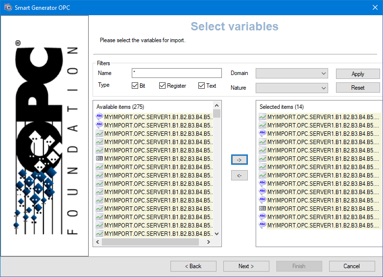 The Smart Generator for OPC is designed to automate the configuration of the PcVue OPC-DA client. It allows you to import items from an external OPC-DA server to generate I/O variables including mapping onto the server and groups.