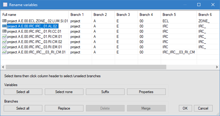 - To replace branch segments, select the variables, then select the branch segments to be replaced by clicking on the column header and click Replace to open the Replace dialog. Enter the strings to search and replace, then click OK.