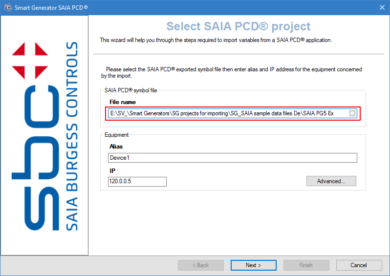 The symbol file is produced by PG5, the Saia-Burgess programming suite. For information on how to generate the symbol file, refer to the documentation provided with PG5. It is not necessary to have the PG5 software installed, nor any devices connected for the smart generator to run.